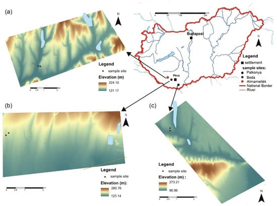 Location of the study sites on the digital elevation model (DEM) generated from a LiDAR survey. (a) Almamellék (pasture); (b) Boda (ploughland); (c) Palkonya-Villánykövesd (orchard).