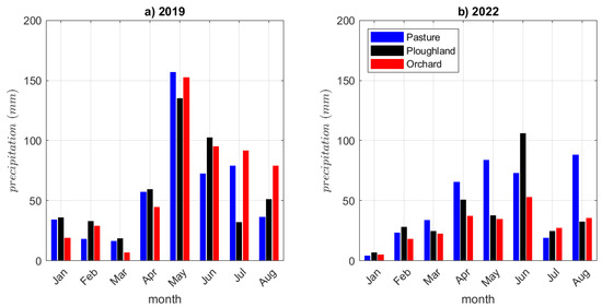 Rainfall distribution showed a rather contrasting picture among the three sites. The highest rainfall for both the summer and the period of January to August was measured for the orchard site in 2019 and for the pasture in 2022, whereas the lowest rainfall total in 2022 was observed in the orchard (Table 3).