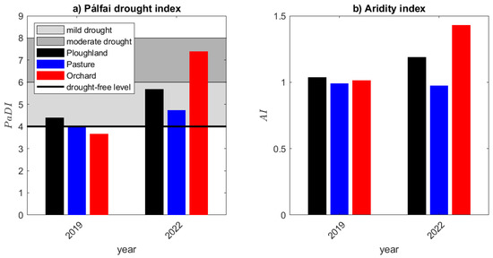 Aridity indices were around 1 in 2019 (common for Hungary since the onset of meteorological measurements), whereas they turned into a negative water balance (AI > 1) for the ploughland and the orchard by 2022 (Figure 3b).