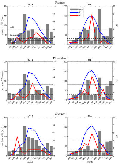 Monthly precipitation totals (prcp), evapotranspiration (ET0) and aridity indices (AI) for the different sites (pasture, ploughland and orchard) of 2019 and 2022. Solid lines depict the value of AI = 1, dashed lines AI = 1.5 and dotted lines AI = 4 as a reference for humid (AI < 1), subhumid (1 ≤ AI ≤ 1.5), semiarid (1.5 ≤ AI ≤ 4) and arid (AI ≥ 4) conditions, respectively.