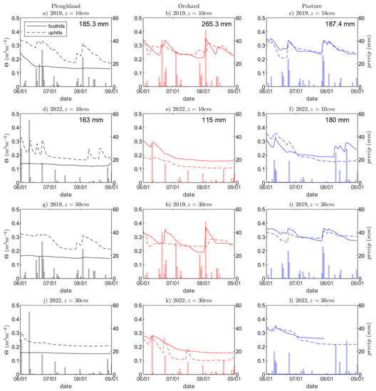 Soil moisture dynamics of the study sites (first column ploughland, middle column pasture and right column orchard) in the summers of 2019 (1st and 3rd rows) and 2022 (2nd and 4th rows), for (a–f) 10 cm and (g–l) 30 cm. The values on the right upper corners in subplots from (a) to (f) represent the precipitation amount during the summer (June to August).
