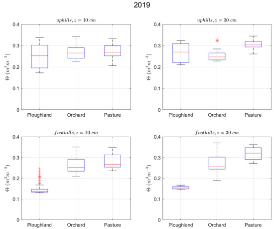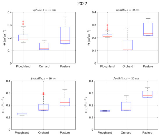 The statistics of SM indicated marked variations among the three land use types. Commonly, the pasture showed the highest SM content, and the ploughland had the lowest median SM values. The footslope station of the ploughland revealed the lowest SM content and the lowest SM range, likely influenced by the grove uphill. On the other hand, the orchard showed the greatest range of SM over the two studied summers due to its extreme water balance and the removal of tree canopy at the upper station (Figure 6 and Figure 7). The natural pasture presented the greatest water stress tolerance and the most homogeneous water dynamics among the three land use types. At all stations, mean and median SM contents in 2022 were either equal to (at the ploughland footslope, 30 cm) or lower than those in 2019 (at all other stations).
