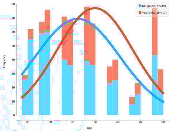 There were 256 participants (~34.6% of 738 participants) with diabetes and 482 non-diabetic participants. The average age of the participants was 44 years, with the age range of 19–78 years old. Before training the data, the dataset was divided by an 80:20 ratio where 80% data were used for the train set and the remaining 20% data were used for the test set. Then, the training data were fed to our model for conducting supervised machine learning techniques. The histogram of the age of participants who had diabetes (mean age = 50) and who did not have diabetes (mean age = 42) is shown in Figure 1. Details of the data properties are shown in Table 1.