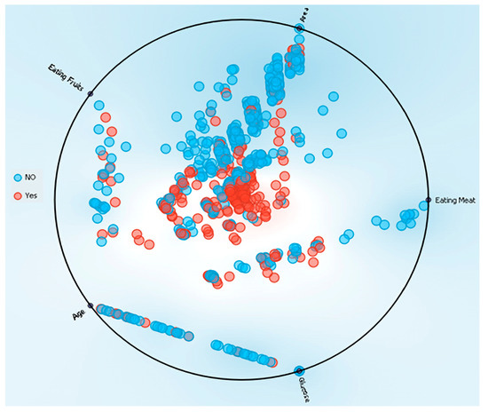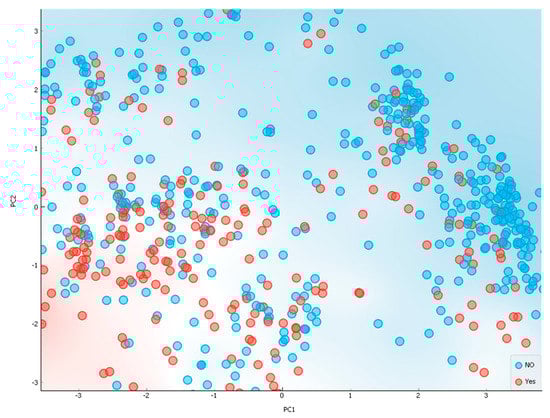 Table 2 presents the rotated component matrix in the PCA, where we can see that the major features that show covariance together in principal component 1 are area (−87.7%), eating meat (83.5%), an education level (82.3%), and eating fruits (80.9%). For principal component 2, the major features are the number of pregnancies (65.5%), gender (60.0%), and age (58.8%). As some features, such as eating fish, eating vegetables, and work stress, did not show any significant (less than 30%) covariance either in the principal component analysis 1 or 2, these 3 features were removed from the initially selected 18 features. Figure 2 shows the scatter plot of principal component 1 (PC1) and principal component 2 (PC2).