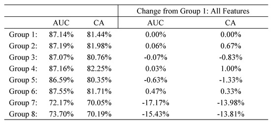 Figure 5 shows the group-wise AUC and accuracy (CA) for logistic regression and the respective changes in comparison to Group 1. For logistic regression, there were 0.06% and 0.67% increases in AUC and CA, respectively, in Group 2 in comparison to Group 1 after PCA, and 0.03% and 1.00% increases in AUC and CA, respectively, in Group 4 in comparison to Group 1 after selecting the top five features (Table 5). Furthermore, to test the effect of blood glucose level, which is a significant clinical feature, on the machine learning model performance, we excluded this clinical feature from the dataset with the initial 18 features. Then, it was found that there were 15.43% and 13.81% decreases for AUC and CA, respectively, in Group 8 when we removed glucose. Furthermore, there were 17.17% and 13.98% decreases, respectively, in AUC and CA in Group 7 when we removed all the clinical features from Group 7. Overall, the performance of the logistic regression for the features in Group 4 was the best after selecting the top four features, and the features in Group 8 were the worst after removing the clinical factors. Moreover, when removing the clinical factors in Group 7, it was found that random forest performed the best (AUC = 70.8% and CA = 70.7%) instead of logistic regression (AUC = 72.2% and CA = 70.1%) for Group 7 only.