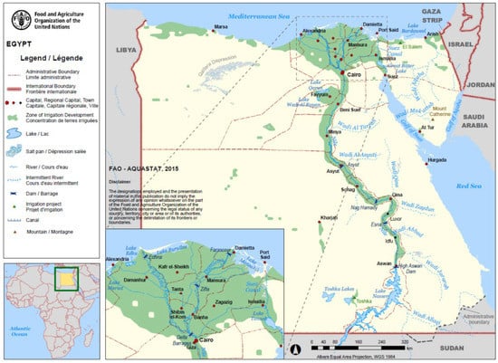 - FAO. AQUASTAT Country Profile—Egypt; FAO: Rome, Italy, 2016. [Google Scholar]