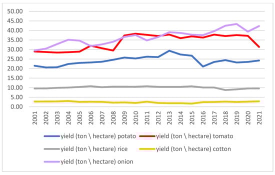| Year | Potato | Tomato | Onion | Rice | Cotton |
