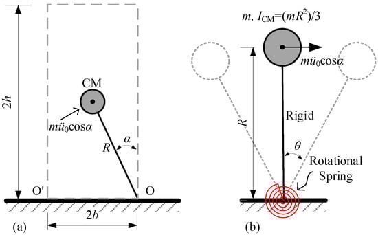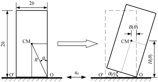 Consider a homogenous freestanding rectangular rigid block (Figure 1) that has the dimensions 2b × 2h, mass m. The center-of-mass (CM) of such a block coincides with its center-of-geometric. The block’s geometry can be fully described using two parameters: the size parameter and the slenderness parameter, . Assume that the coefficient of friction between the block and its rigid base is big enough so that rocking (including overturning when the rocking angle is too large) is the only dominating mode. Its rotational moment of inertia to the pivot point O or O’ is . In the simplest case, this system is SDOF.