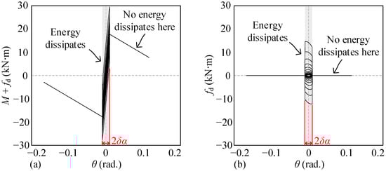 Hysteresis of the SDOF model: (a) total resisting moment vs. rocking angle, (b) damping force vs. rocking angle.