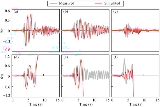 The performance of the discrete damping model has been validated by a comparison with the experimental results of Nasi [64,65,66]. Figure 4 displays six selected runs of rotation-time history derived from the experiment and the simulation. The comparison shows that this numerical model with discrete damping can correctly approximate the maximum rocking angle and predict overturning [59,60].