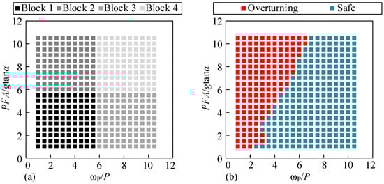 By exposing each model to 100 one-sine pulse excitations of different PFA and ωP, we derived simulated results for 400 uniformly distributed cases (Figure 6a). A boundary can be observed between the overturning and safe area (Figure 6b), as Zhang and Makris [38] concluded. The occurrence of overturning corresponds to ωP/P and PFA/gtanα, both widely-used IMs. However, using either one of these methods alone is insufficient for an overturning fragility analysis, highlighting the advantage of bivariate IMs [56]. Furthermore, this fact also consists of the motivation of this paper, which is that a good IM for an overturning fragility analysis should include as much of the excitation characteristics (e.g., PFA and ωP) and the block geometry information (e.g., R and α), as mentioned in our former research [59].
