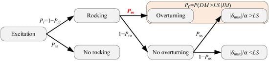 To facilitates the calculation of conditional probability Pf, Dimitrakopoulos and Paraskeva [56] have presented a probability tree diagram that takes into account the peculiarities of the rocking responses (Figure 7). The probability Pf is calculated by combining two likelihoods, i.e., the rocking-overturning probability (Pro) and the probability of DM surpassing LS without overturning (Pex). As the probability Pex during safe rocking has been studied [59], this paper focuses on deriving the overturning probability Pro, and a comparative study of a suite of IMs has been conducted on the performance of deriving the overturning probability.