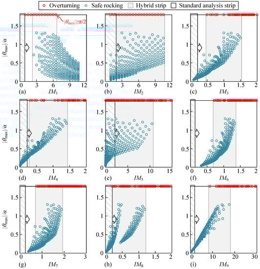 Figure 8 displays the simulated rocking responses against the varying values of different IMs. There exists a particular hybrid IM strip (HS), within which both safe rocking and overturning occur, and outside of which a clear distinction can be made between the two states of safe rocking and overturning. To quantitively estimate the size of the HS, the hybrid ratio (HR) is presented in this paper to compare the performance of various IMs for predicting overturning (Figure 8). The parameter HR defined in Equation (12) can assess the performance of different IMs to evaluate whether a rigid block will overturn if subjected to an excitation.