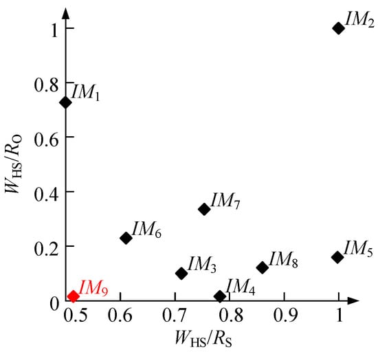 Figure 9 offers a comparative evaluation of all the examined IMs. The novel IM9 is the closest to the origin of the coordinates, i.e., the HR of IM9 is the smallest (Table 2). Although IM1 has the smallest WHS/RS (0.50), IM9 is close to it (0.51). These results indicate that IM9 can best identify the state transition from safe rocking to overturning compared with the other eight IMs.
