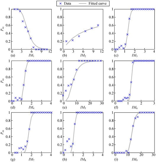 Figure 10 shows the overturning fragility curves for different IMs obtained by fitting the overturning probability data. For comparing the performance of various IMs in estimating the overturning probability, the fitted analysis parameters are used to generate the coefficient of variation (CV) in this paper. CV is a standardized measure of the dispersion of a probability distribution defined as the ratio of the standard deviation β to the mean μ. Compared with the other eight IMs, IM9 exhibits obvious superiority by having the smallest CV (Figure 11). Therefore, IM9 is recommended as an IM for overturning fragility analysis.