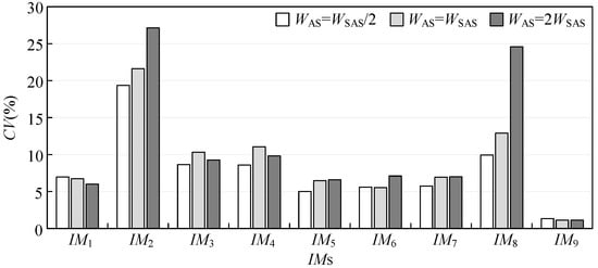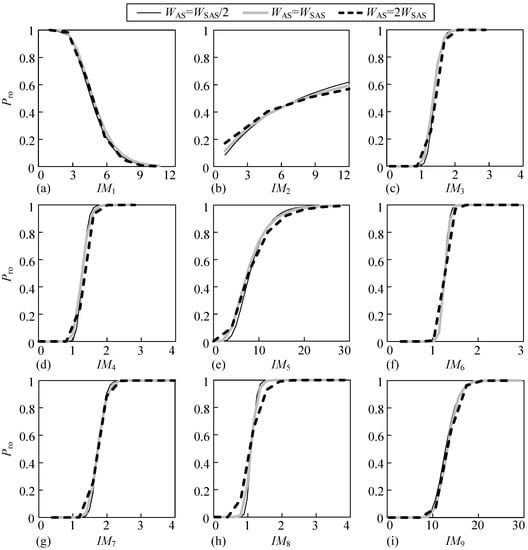From the process of an overturning fragility analysis, it can be found that the width of the analysis strip may affect the fragility curves. To examine this effect, we adjusted the width of the analysis strip (WAS) to half and twice WSAS, respectively. Figure 12 shows that, for all nine IMs, the overturning fragility curves obtained for different analysis strip widths are almost the same. The fragility curves have good robustness for different widths of the analysis strips. IM9 maintains the smallest CV, which once again proves its superiority for overturning fragility analysis (Table 3).