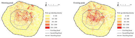 Spatial distribution of pick-up ridership density of ride-hailing.