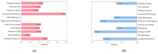 Figure 6 shows the spatial distribution of the elasticity coefficient of the built environment variables of the MGWER model. A positive elasticity coefficient indicates that the variable is positively correlated with demand for ride-hailing, which is represented in red. A negative elasticity coefficient indicates that the variable is negatively correlated with demand for ride-hailing, which is represented in blue. The darker the color, the greater the relative influence on ride-hailing ridership.