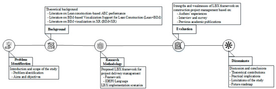In light of the fact that the interactive relationships and integrative applications of Lean-BIM and BIM-XR are expected to be effective, the purpose of this study is to critically assess the shortfalls and incoherence in the pertinent literature to conceptualize the integration of lean, BIM, and XR, as well as to propose new research directions in the field. LC, BIM, and XR are increasingly being used in AEC projects, but the integration of these three is often neglected to increase design and construction efficiency. This research strongly suggests using a Lean-BIM-XR project delivery management system to optimize the advantages of AEC project performance. As shown in Figure 2, this paper starts out with a literature review of the previous work on the concepts of LC-based AEC performance, BIM-based visualization support for LC (Lean-BIM), and BIM visualization in XR (BIM-XR) in the AEC industry in Section 2. This section also presents an overview of the most commonly used wearable XRs on the market. In Section 3, this paper presents an LBX process flow diagram and an IDEF0 diagram for the LBX project delivery management system in each stage of AEC projects, which consists of the design, construction, and operation stages. Section 4 suggests two possible scenarios for integrated lean, BIM, and XR implementation, which are referred to as “in the office” and “online/semi-online LBX meetings”. Section 5 presented the LBX management system’s strengths and weaknesses. In Section 5 and Section 6, this paper concludes with the practical implications and open challenges of applying LBX to project management tasks.