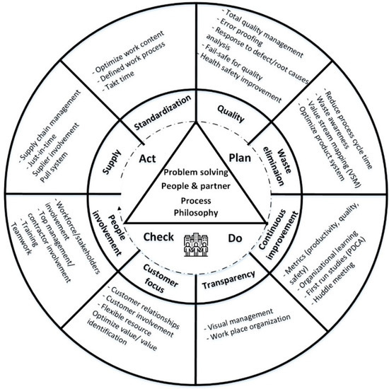 LC aims to ensure that all aspects of the built environment function together and develop simultaneously everything from design to demolition [35]. This approach aims to manage and enhance construction processes through value-adding activities, such as the use of tools and techniques, as well as the perception of the production process as a continuous flow of materials, information, equipment, and labor, all while keeping costs low and maximizing value by taking into account customer needs. In accordance with numerous publications [36,37,38,39,40], some of the activities of lean thinking in the construction industry are summarized below: