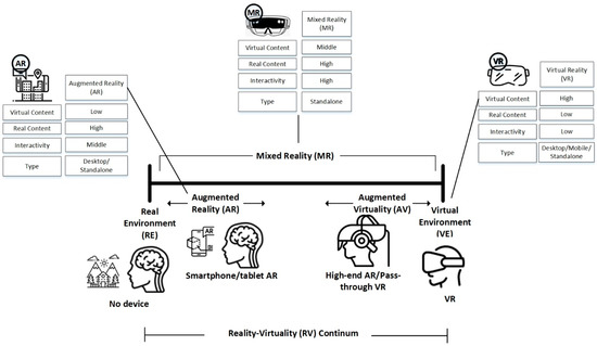 Extended reality (XR) refers to any physical and digital mixed environments, as well as human–machine interactions, that are formed by computer technology and wearables. The letter “X” represents any spatial computing technology, whether existing or future, that might be used [16]. Computer technology and wearables create all kinds of real and virtual integrated worlds and human–machine interactions, which are referred to as XR. XR may be characterized as an umbrella term that encompasses all three realities of AR, VR, and MR [6]. More and more people are using the term “XR” to put VR, AR, and MR experiences into real projects in the AEC industry, even though the term’s meaning is sometimes unclear and defined in different ways. Figure 4 shows the differences between VR, AR, and MR.