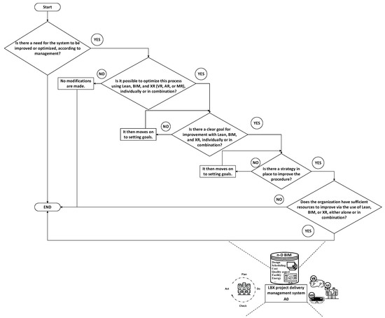 The key focus of this research is to conduct a review of existing BIM, XR, and lean approaches and techniques in the design and construction sectors to establish a conceptual model for integrating these principles and technologies as a unified process. This paper examines previous work on lean, BIM, MR, Lean-BIM, and BIM-XR, and provides a conceptual framework for enhancing construction project performance termed the “LBX project delivery management system”. The procedures of the framework are described by the flowchart in Figure 6 and the IDEF0 model in Figure 7.