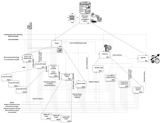 To effectively develop a management system strategy for any practical applications, the first step should be to obtain a comprehensive knowledge of the process. IDEF0 is one of the approaches that may represent industrial operations and communicate complicated ideas using simple boxes and arrows [106]. It helps develop, analyze, and integrate systems such as lean, BIM, and XR. The presented model in this study, graphically shown as an IDEF0 diagram, depicts an AEC project delivery management system. This adaptable, comprehensive, and understandable model is ideal for illustrating the interconnections between the pre-construction (design) and construction phases. Key processes are outlined in the boxes in Figure 7.