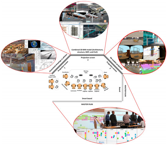 In the office, LBX rooms are basically dedicated meeting spaces in the workplace or office that allow stakeholders to focus on a certain project comprehensively as a whole, with a broader picture of the project than the narrow specialized areas where they do their day-to-day tasks. Physical space distribution has a direct impact on how professionals develop their tasks, even more so when working in a collaborative context such as lean, BIM, or XR. To facilitate more effective interactions, it is necessary to remodel the company’s workspaces. Figure 8 shows a sample of using the office LBX environment system for a collaborative planning session and a close-up view of the smart master plan, nD BIM model display boards, XR display boards, and how a similar room space should be organized. The use of an LBX room is useful to bring together the owner and the other disciplines, achieving an integrated collaborative process. Professionals can work from their computers, different boards containing various linked data, reports, models, and documents, and they can also walk through a real-scale environment through their VR, AR, or MR devices and even share what they see on the XR projection screen. Furthermore, the LBX collaboration environment acts as a meeting and decision-making space for all project stakeholders to uncover issues or come up with creative tactics to develop new and constructive ideas and options.