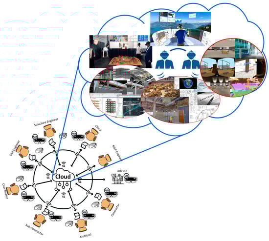 Figure 9 demonstrates the second proposed scenario, which is an online or semi-online LBX-based environment. In this scenario, the project team members are not situated in an LBX room together, so they have to be connected through online systems. So far, they rely on online video and audio conferencing software/platforms such as Google Meet, Microsoft Teams, Zoom, Skype, WhatsApp, and others. Various challenges affect these types of meetings, and they are not really as accurate and effective as people just hearing or seeing each other or 2D or 3D files on the screens. In the LBX system, all stakeholders are connected to a central cloud-based system and obtain access to shared files in 2D, 3D, 4D, or even 5D. Additionally, each one of them needs to be connected to these files through their VR or MR to see the nD BIM models. Through this system, all stakeholders are able to communicate scheduling, cost, quality, and various scenarios in a real-scale environment. In this process, some stakeholders can be gathered in the office while the rest from other locations can attend the meeting online. This system allows streamlined collaboration for the AEC industry and allows architects, engineers, general contractors, on-site personnel, and other stakeholders to spin up inputs in real time. Implementation of LBX conferencing tools and features facilitates better training, project management, and real-time environment-based communication with site teams, clients, etc. These cloud-based systems enable AEC companies and users the potential to leverage powerful project collaboration all under one roof. In this scenario, the BIM software, 2D CAD, pictures, documents, time scheduling, and cost estimating can be seen through XR devices and collaborated on while they are walking through the real-scale project with high-quality BIM models. As they can during office LBX meetings, all stakeholders can obtain access to all data and documents while they are able to share their experiences and suggestions through smart lean software. This system facilitates the completion of several tasks and the sharing of ideas among participants in kick-off meetings, construction meetings, project team meetings, contractor and subcontractor meetings, and so on. Microsoft Mesh for Teams and Meta Horizon Workrooms are new platforms to achieve this scenario.
