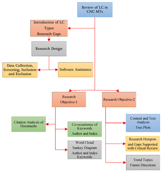 Figure 1 depicts a workflow of the presented review of LC in CNC MTs. The basic ideas of LC in CNC MTs were reviewed, appropriate literature was scrutinized, and research questions were decided. The relevant literature on LC in CNC MTs was studied, and is presented in Section 1. The research design is described in Section 2.1; it includes the steps followed to collect data and to decide on inclusion and exclusion, and shows details of the software assistance. After that, answers to the objectives and research questions are detailed, along with hotspots, gaps, and future scope in the following sections. Section 3 describes the central solutions to research objective 1, including the citation analysis of documents and the author and index keywords analysis. The keywords analysis also consists of the word cloud and Sankey diagrams. Research objective 2 is covered in Section 4, including content analysis and tree plots. Section 5 also covers research objective 2 and describes research hotspots, and Section 6 describes research gaps and future directions, and is supported by a critical analysis of the linked literature. Section 7 describes trending topics and offers concluding remarks based on the content and visualization analysis.