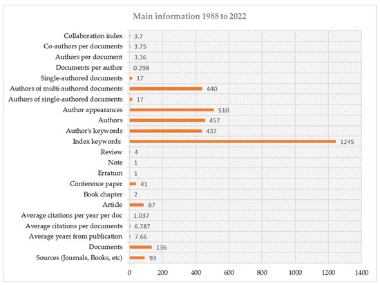 Figure 2 depicts vital information about LC in CNC MTs. It comprises 136 documents retrieved by Scopus between 1988 and 2022. The compiled documents were written by 457 authors, who contributed 510 times. There were 136 documents with several authors, contrasted with the 17 with a single author. The literature on LC in CNC MTs has been published in 93 sources. A total of 437 author keywords were in the texts, whereas 1245 were indexed. Out of 136 documents, there are 4 review documents with a 3% contribution, 1 note and an erratum of 1%, 41 conference papers with a contribution of 30%, 2 book chapters of 1%, and 87 articles with a maximum contribution of 30%. The published work on LC in CNC MTs has an average age of 7.66 years and 6.787 citations.