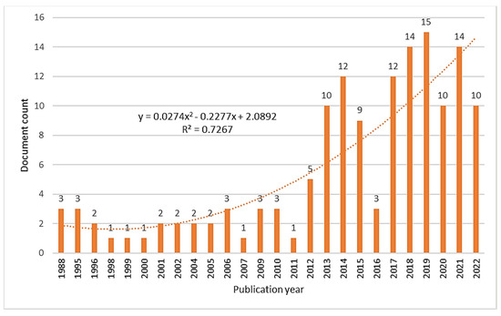 Figure 3 shows how documents on LC in CNC MTs were published yearly from 1988 to 2022. Three documents were published in 1988, but from 1998 to 2000 only one paper was published. From the year 2001 to 2005, two documents were published. After that, the published documents ranged from one to three, from 2006 to 2011. Then, the document publication rate increased by five in the year 2012. In 2013, ten papers were published, followed by twelve in 2014. In 2015, document publication decreased, and nine were published, compared to 2014; in 2016, only three were published. In 2017, there was a spike of nine documents compared to 2016. In 2018, 14 papers were published, followed by 15 documents in 2019, 10 in 2020, 14 in 2021, and only 10 in July 2022.