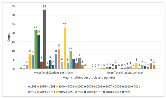 Figure 4 portrays a citation analysis of the published work of LC in CNC MTs. It shows, starting in the year 2019, cumulative citations. The data was collected on LC in CNC MTs from 1988 to 2022, so there is zero citation of published work from 1988 to 1995. No work was published on LC in CNC MTs from 1988 to 2022. There were zero mean citations per article and per year in 1988, 1997, 1999, 2003, 2005, and 2008. In 2007 there were a maximum of citations per article of 33 and a minimum of citations per article of zero in 2015.