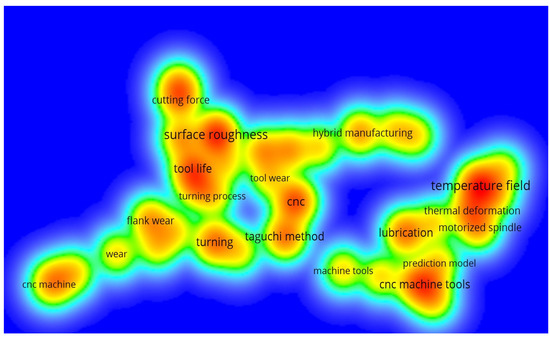 The author’s keyword of LC in the CNC MTs density map is revealed in Figure 5. It comprises 52 author keywords out of 438, with the smallest occurrence of 2 and 39 linking. The author’s keywords are separated into 7 clusters. For example, the author’s keywords “surface roughness”, “Taguchi method”, “CNC machine tools”, “flank wear”, and “turning” displays an extreme incidence of occurrence LC in CNC MTs. The author’s keywords such as “hybrid composite”, “stir casting”, “surface integrity”, and “electrode wear rate” have fewer frequencies of occurrence. There are 39 items in total, i.e., LC in CNC MTs author keywords are divided into seven clusters: