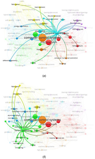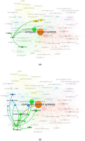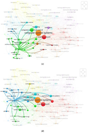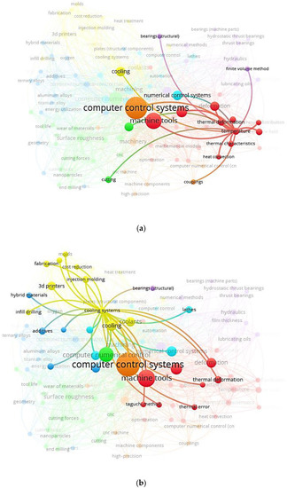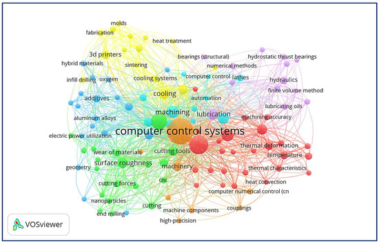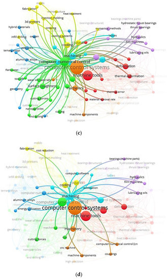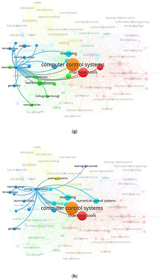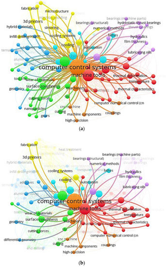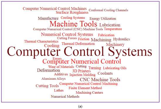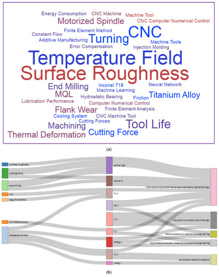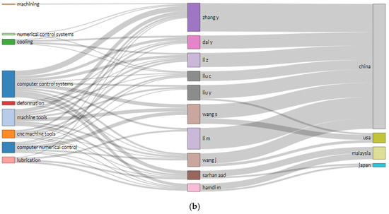 Figure 8 depicts a word cloud of LC in CNC MTs index keywords and links between index keywords published by authors and nations. It is a graphical depiction of the words frequently appearing in an author’s work. The terms are often presented in various sizes, with the most commonly used word, LC in CNC MTs, appearing in the biggest type. Figure 8a can quickly identify themes and topics of index keywords. For example, computer control systems, computer numerical control, machine tools, and numerical control systems have the largest font, so they have a greater appearance.