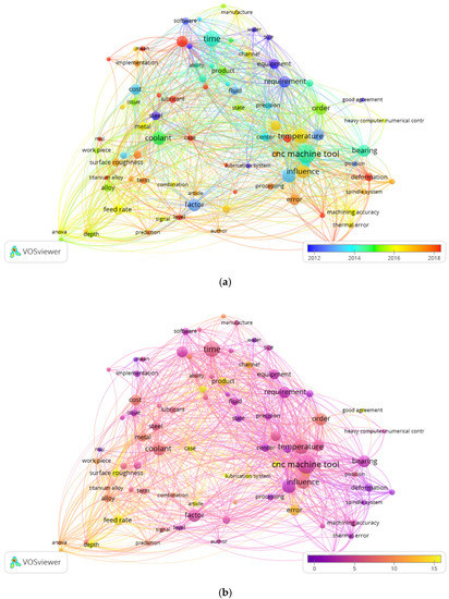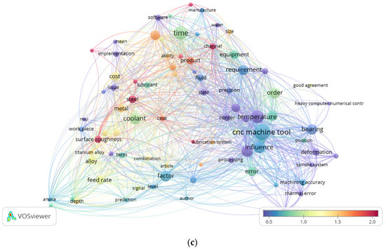 This visualization can help identify emerging trends or collaborations in a particular research field, allowing us to see which authors or keywords appear together more frequently in recent publications. The overlay visualization of the title and abstract terms of LC in CNC MTs is displayed in Figure 9. The occurrence of title and abstract terms of LC in CNC MTs based on average publication year is shown in Figure 9a. The occurrence of title and abstract terms of LC in CNC MTs based on average citations is shown in Figure 9b. Finally, the occurrence title and abstract terms of LC in CNC MTs based on average normalized citations are shown in Figure 9c.