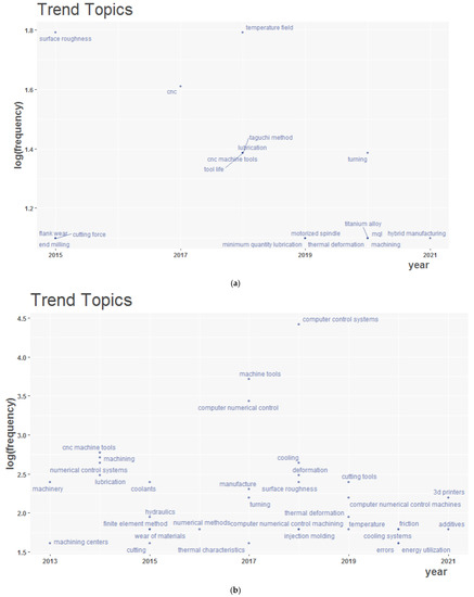 A tree plot in rectangles, often known as a treemap, visualizes hierarchical data structures. The data in this graphic is represented by nested rectangles, with each rectangle representing a node in the tree. The size of each rectangle is proportional to the node’s value, and the rectangles are layered, to depict the data’s hierarchical structure. Treemaps are frequently used to represent enormous quantities of hierarchical data compactly and understandably. Figure 10 depicts the tree plot of title and abstract terms utilized in LC in CNC MTs. Figure 10a shows a tree plot of title terms of LC in CNC MTs; the term CNC occurred 34 times, with a contribution of 8%. CNC was followed by machine, tool, machining, and thermal, occurring 32, 20, 18, and 17 times, respectively, with a contribution of 8%, 5%, 4%, and 4%, respectively. Figure 10b shows a tree plot of abstract terms of LC in CNC MTs; the term machine occurred 235 times, with a contribution of 7%. Machine was followed by CNC, machining, tool, and cutting, occurring 178, 146, 146, and 132 times, respectively, and contributing 5%, 4%, 4%, and 4%, respectively.