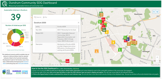 Screenshot of the Community SDG Dashboard showing current sustainable initiatives in Dundrum and a pop-up window with additional detail about one such initiative.