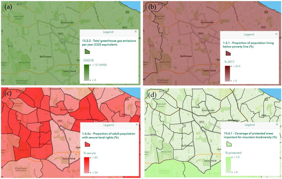 With the above considerations in mind, this academic–community partnership resolved to co-define a UN-aligned indicator set that links to current local concerns and initiatives and, based on this, co-design a framework for monitoring change. This led to the co-creation of an indicator-led monitoring toolkit, in the form of a GIS-based interactive and user-friendly SDG dashboard for communities (see Supplementary Material). The dashboard is to provide a systematic and spatially specific means for data gathering, visualization, and analysis, with the overall aim of developing a means by which local data can facilitate, influence, and feed into national sustainability reporting mechanisms as currently undertaken by the Government of Ireland (https://irelandsdg.geohive.ie). The co-creation approach was driven by an underlying aspiration for social engagement in delivering and monitoring local sustainability activities, aligning with the Dundrum 2030 community group’s goals. The process of developing the dashboard and its future application contribute to awareness-raising and capacity-building within the community.