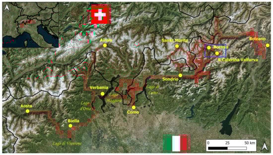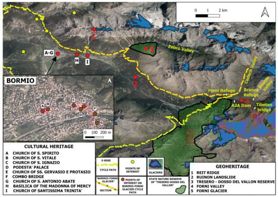 In this study, we described the points of cultural and environmental interest with a focus on geological and geomorphological features, selected within the framework of the “E-bike” project, considering the stretch from Bormio to Forni Glacier (Upper Valtellina, Central Italian Alps, Figure 1), in order to investigate the role of e-bikes in promoting geotourism and in the discovery of geodiversity and geoheritage. We chose this section of the “E-bike” path due to the presence of geoheritage sites (also known as geosites) with different characteristics, from a landslide to a glacier. Moreover, Bormio and its surroundings represent one of the most important destinations for tourism in Lombardy (some places can be enjoyed both in summer and in winter). The area was also chosen from among the most representative landscapes of the Italian territory []. The Bormio–Forni Glacier area has an elevation ranging from 1225 m a.s.l. (Bormio) to 3670 m a.s.l. (Mount San Matteo) [,]. Our study sites were located in the Ortles-Cevedale area that is geologically heterogeneous, with a close contact between sedimentary and metamorphic rocks [,]. In particular, the Zebrù Tectonic Line separates pre-Permian mica schist and paragneiss in the southern area from the Rhaetian dolomite and limestone outcropping in the northern part of the region [].