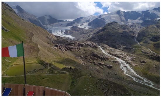 Glaciers can be considered as geoheritage sites, as reported by Pelfini and Gobbi (2005), for example []. In fact, glaciers are widely recognized as the best witnesses of climate changes [], making them of relevant scientific and cultural value. Moreover, they are included on the watch list as degrading natural assets, since they are affected by rapid changes (that a tourist can well appreciate), particularly in the related hazard scenarios. These could have important implications for tourism in glaciated and proglacial areas [,]. In fact, here the impact of climate change is particularly evident: the widening of proglacial areas and changes in surface processes (e.g., hydrological, mass movements, etc.) are creating new hazard and risk scenarios for tourists. However, an easier accessibility to the glacier area can also lead to new impacts on flora and fauna [].