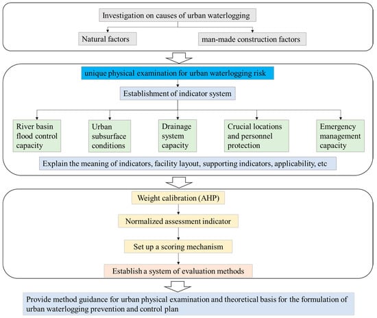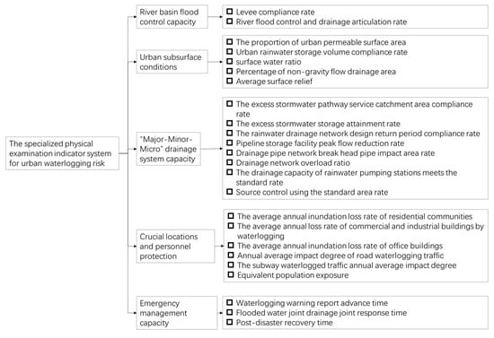 With the rapid development of urbanization in China, urban waterlogging has become a significant problem in constructing the safety of the human environment. As an essential manifestation of the modernization of the urban governance system and capacity, the city physical examination establishes a multi-criteria evaluation system for problem diagnosis, rectification, and improvement. In order to accurately identify the risk of urban waterlogging, the concept of special physical examination of urban waterlogging risk was established, and the evaluation mechanism and indicator definition were improved on the basis of the “four-factor method” of flooding disaster assessment. From the perspective of urban basin flood control capacity, background disaster-bearing conditions, “Major-Minor-Micro” drainage system capacity, crucial locations and personnel protection, and emergency management capacity, twenty-four indicators in five categories were selected. The interaction between multiple factors is considered to establish a special physical examination indicator system as a characteristic evaluation mechanism of waterlogging with the goal of urban safety and resilience. The results of the study could provide theoretical and technical support for the diagnosis of urban waterlogging risk problems and the formulation of prevention and control strategies.
