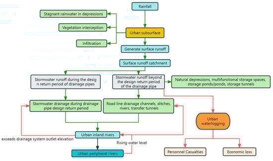 Urban waterlogging is a prominent problem faced by many countries and regions under the background of global warming and rapid urbanization [1,2,3]. In recent years, rainstorms and waterlogging events occur frequently in many cities around the world, which not only cause huge property losses but also threaten people’s safety. Since July 2021, heavy rainfall has hit many cities around the world, and Europe has suffered the worst floods in 50 years, causing heavy casualties and economic losses. Germany was affected by heavy and persistent rainfall, including the overflow of the Rhine River, which caused flooding in the western and southwestern regions. As a traditionally developed country with complete drainage facilities, Germany has suffered up to 180 casualties and billions of euros in property damage [4]. On 17 July 2021, a severe storm disaster occurred in Henan Province of China, flooding many cities, paralyzing urban traffic, and flooding into the subway space, causing severe casualties [5,6]. According to the statistics of China Flood and Drought Disaster Bulletin, from 2016 to 2020, waterlogging disasters occurred in more than 180 Chinese cities every year, with an average impact of more than 60 million people. Urban waterlogging is a type of urban flooding that is defined as a phenomenon in which heavy or continuous rainfall within a town exceeds the capacity of the town’s stormwater facilities, resulting in the accumulation of water on the surface of the town [7], also known as “urban flooding and pluvial floods (flash floods and surface water)”. In the context of increasingly serious global flood disasters, scientific and reasonable urban flood disaster risk assessment is helpful to improve urban disaster prevention and mitigation capacity and reduce flood losses.