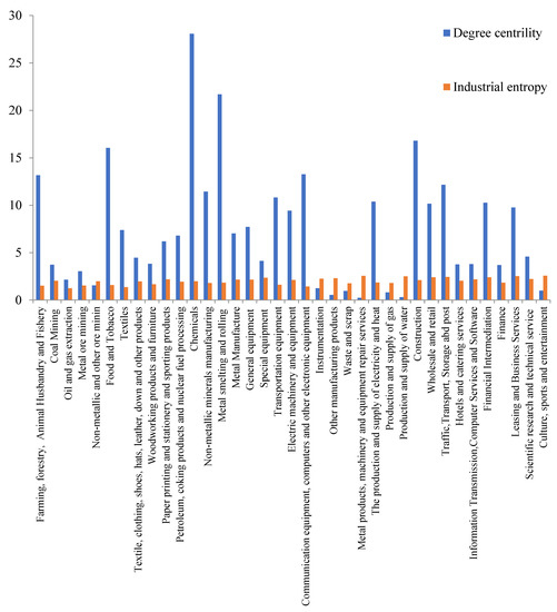 Degree centrality and industrial entropy of industrial linkage structures in China (by industry).