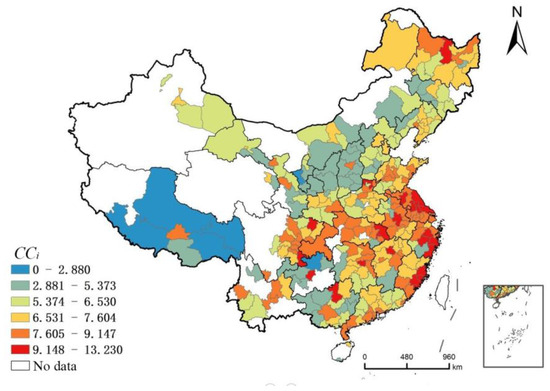 The above two attributes are measured using input–output tables and are calculated at the industry level. However, these tables are only compiled based on national and regional industrial linkage data, and do not exist at the city level. Therefore, to convert the characteristics of industrial linkage structures into the city level measures, this study applies the research of Han et al. [30] and uses city employment data for each industry to reflect the local importance of each industry, calculates the weights using the city employment data in each industry, and then measures the centrality and industrial entropy of industrial linkage structure of each city. Let CCi and CIEi be the centrality and industrial entropy of the industrial linkage network of city i., respectively, which can be calculated using Equations (3) and (4):