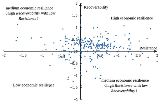 The quarterly GDP data for cities in 2020 were then entered into Equations (6) and (7) to calculate the Resistance of each city using the data for the first quarter, and to calculate the Recoverability of each city using data for the second, third, and fourth quarters. Figure 5 shows the results of the economic resilience of cities in China. In the four quadrants of figure, the first quadrant indicates the cities for which both Resistance and Recoverability are positive; these cities have high levels of economic resilience. The second and fourth quadrants represent the set of cites with high Recoverability but low Resistance, and high Resistance but low Recoverability, respectively. These cities are considered to have medium economic resilience. The third quadrant indicates cities for which both Resistance and Recoverability are negative; these cities have low levels of economic resilience. Overall, most cities in China have high economic resilience. There are 149 cities in the first quadrant with high economic resilience, and only 33 cities in the third quadrant with low economic resilience. This indicates that China’s urban economy showed relatively strong resilience under the impact of the COVID-19 pandemic.