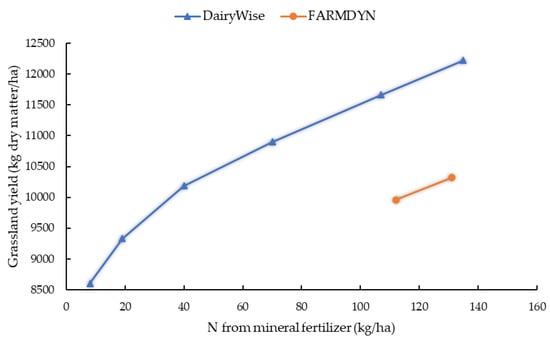 Figure 1 shows the response on mineral fertiliser N for a situation with a manure N rate of 270 kg manure N per ha grassland (applied slurry and excreted during grazing; situation in the baseline and scenario) for DairyWise. For the baseline, the effective N from manure and mineral fertiliser (about 215 kg N per ha) was 32% lower than the calculated N demand (315 kg N per ha, based on national fertiliser recommendations) []. The grassland N response relationship in DairyWise is used as input in Farmdyn to parameterise the relationship N input and grassland yield for the different grassland management options in Farmdyn. Consequently, this mimics the slope of DairyWise (Figure 1). Grassland yield in DairyWise refers to the field net yield, including feeding and storage losses and excluding field losses and the grassland yield in Farmdyn refers to feed intake, excluding feeding, storage, and field losses. Based on these response relationships and the price ratio between produced grass and mineral N fertiliser, Farmdyn calculates the optimal mineral fertiliser N rate, respecting the legally allowed levels of N from animal manure and total N from animal manure and mineral fertiliser.