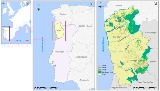 The geographic location of the study area, the Entre-Douro-e-Minho (EDM) agrarian region, in (a) European, (b) Iberian Peninsula, and (c) regional contexts. The location of the Natura 2000 areas and High Nature Value farmlands type 1 and 2 (HNVF1, HNVf2, respectively) are also represented.