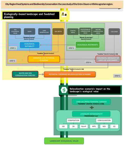 Agriculture is the dominant form of land management with at least half of the species in Europe depending on agricultural habitats. Additionally, there is a growing demand for a more sustainable food system. In that context, food system relocalization and City-Region Food Systems (CRFS) are proposed for food resilience and environmental sustainability. This work represents the first attempt to map the relocalization of the potential foodshed (PF) of the Entre-Douro-e-Minho agrarian region, assessing its impacts on landscape heterogeneity and ecological value. The methodological approach, developed in a Geographic Information System, aimed to (1) map the ecological suitability of the study area, (2) propose a PF relocalization scenario, and (3) assess its impacts on land cover changes and landscape structure through landscape metrics. Outcomes of this research reflect land-use optimization concerning ecological suitability for agrarian uses, depicting the strong presence of temporary crops in the landscape. They also emphasize the need for greater detail in Land Use Plans, due to the vulnerability of coastal areas. Moreover, results revealed an increased landscape heterogeneity and related ecological value, highlighting the integration of landscape ecological properties into CRFS planning as a line of research and contributing to the implementation of land use compatible with biodiversity conservation.