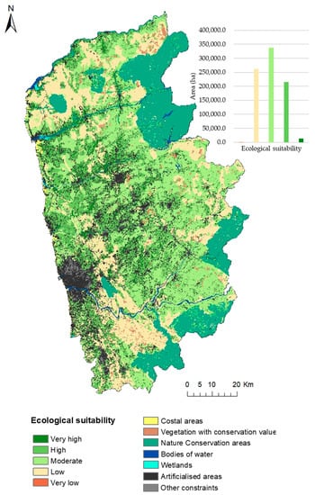 The ecological suitability (ES) assessment following the three ecological criteria (e.g., soil ecological value, terrain morphology, and slope) resulted in a spatially explicit map (Figure 3). The outcome represents the distribution of different suitability levels (e.g., very high, high, moderate, low, and very low), revealing the prevalence of land with moderate suitability (338,238 ha; 38.6%; i.e., essentially located on slopes above 8%), followed by reduced (262,462 ha; 30%) and high (215,546 ha; 24.6%) ES. Only 1.6% (13,769 ha) of the territory shows very high ES.